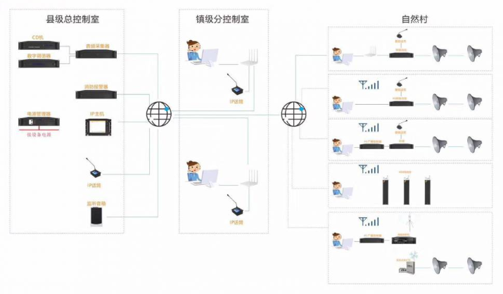 在有IP網(wǎng)絡(luò)的地方,接上 IP網(wǎng)絡(luò)廣播終端設(shè)備即可;在沒有IP網(wǎng)絡(luò)的地方,建設(shè)一個簡易的IP網(wǎng)絡(luò)也相對快捷。